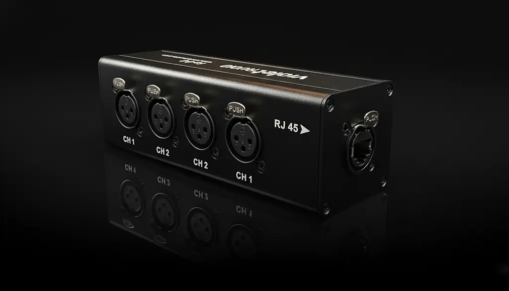 The io44 uses an RJ45 connector for professional audio, video, and networking applications. The adapter can carry 4 analog XLR audio signals over a single RJ45 network cable. It can connect audio from mixers, microphones, and instruments to the XLR ports and route all 4 signals over a shielded balanced Ethernet cable to another io44, splitter device such as the DX08B and DX16B.